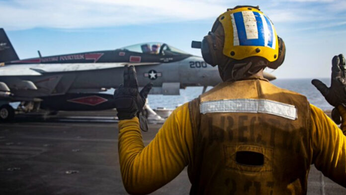 Η Κεντρική Διοίκηση των ΗΠΑ (U.S. Central Command – CENTCOM) δημοσίευσε φωτογραφία από αεροναυτικές επιχειρήσεις που δείχνει Αμερικανό ναύτη να δίνει σήμα σε μαχητικό F/A-18E Super Hornet καθώς αυτό ετοιμάζεται να απογειωθεί από το κατάστρωμα του αεροπλανοφόρου USS Abraham Lincoln (CVN-72).