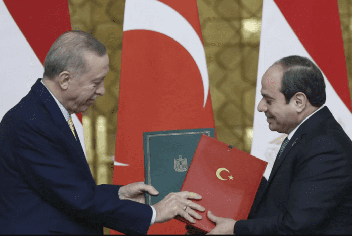 Σε μια προσπάθεια επαναπροσέγγισης βρίσκονται, μετά από πλέον μια δεκαετία, Άγκυρα και Αίγυπτος, την οποία επισφραγίζουν σήμερα με το τετ-α-τετ που θα έχουν Ερντογάν και Σίσι στην Άγκυρα. Στην ατζέντα των δύο ηγετών η αμυντική συνεργασία, συμπεριλαμβανομένης της πιθανής προμήθειας τουρκικών μη επανδρωμένων αεροσκαφών στην Αίγυπτο, η ενίσχυση του διμερούς εμπορίου για αύξηση του όγκου από σχεδόν 10 δισεκατομμύρια δολάρια σε 15 δισεκατομμύρια δολάρια καθώς και οι προσπάθειες για την επίτευξη κατάπαυσης του πυρός στη Γάζα με παράλληλο συντονισμό της ανθρωπιστικής βοήθειας