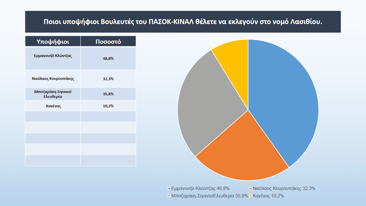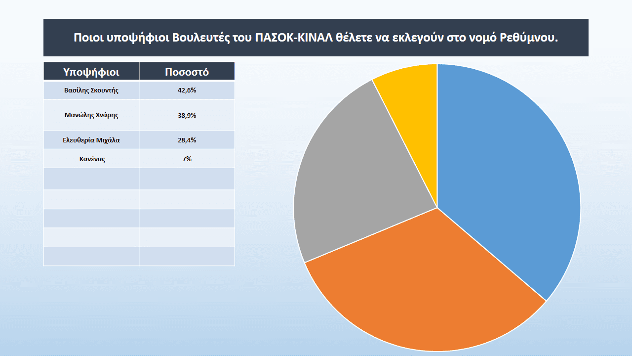 Αναλυτικά ακολουθούν σε πίνακες όλα τα αποτέλεσματα της έρευνας ανά Νομό, σε ολη την Κρήτη , μαζί με το ποσοστά που κερδίζουν όλοι οι υποψήφιοι των κομμάτων.