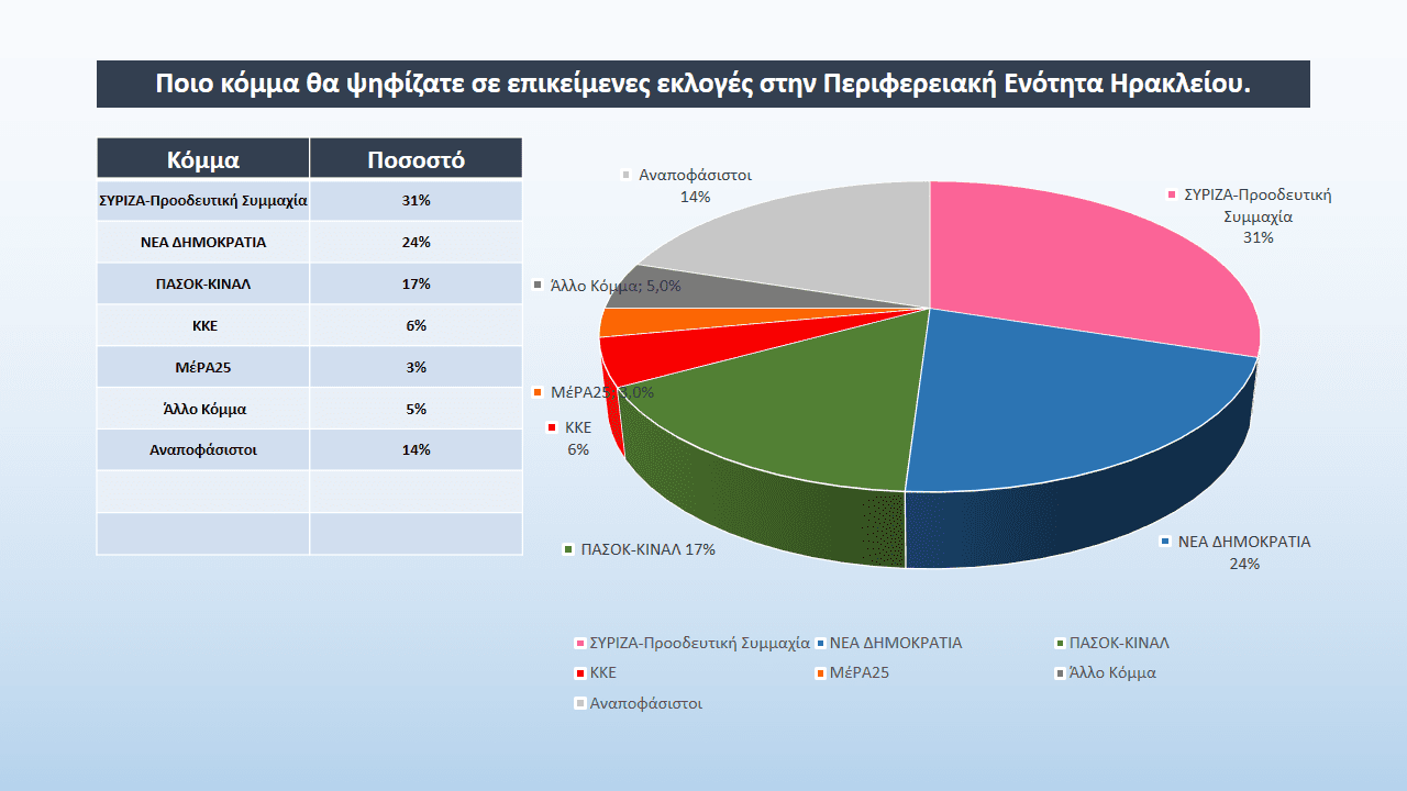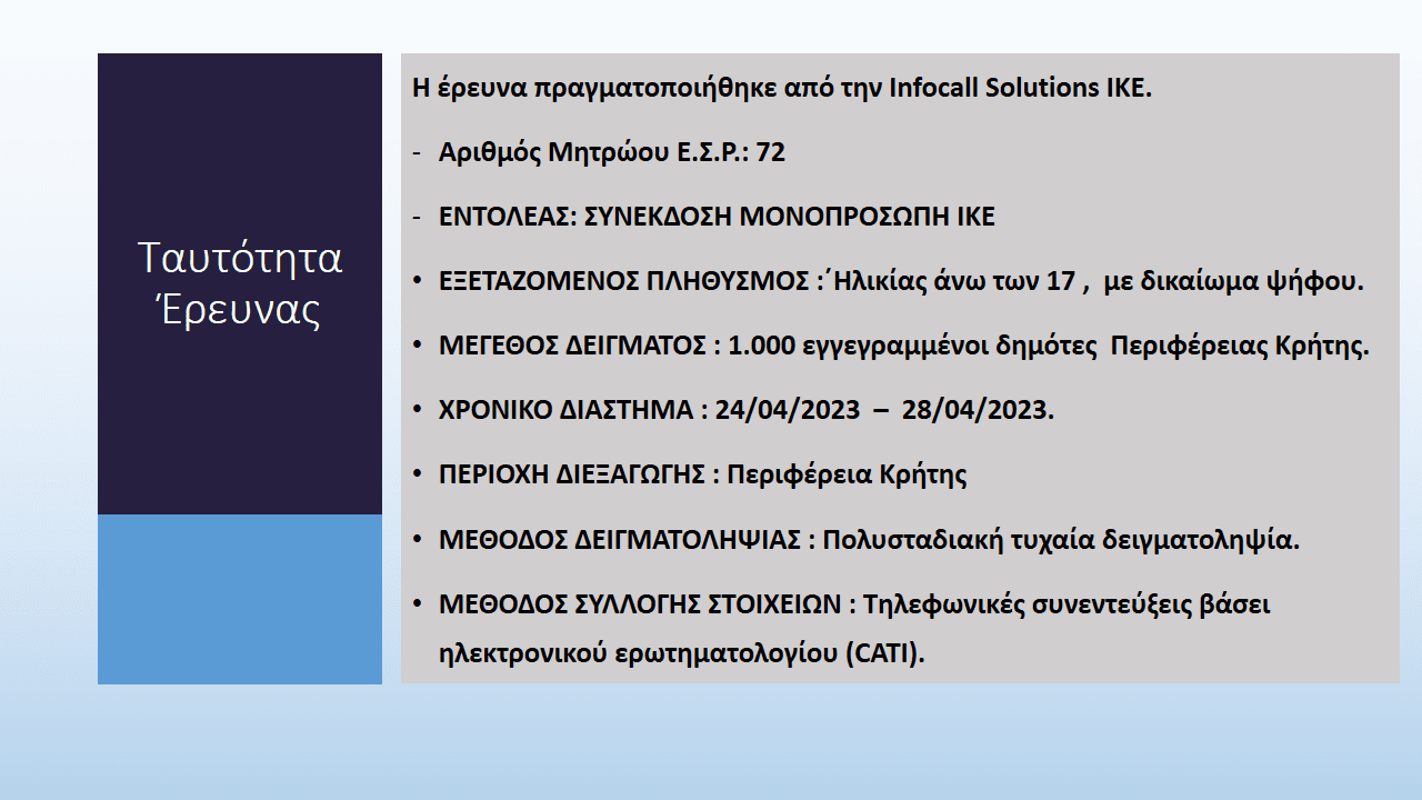 Αυτά διαπιστώνει η πρώτη δημοσκόπηση που έγινε στην Κρήτη, για λογαριασμό του ΕΠΕΝΔΥΤΗ (iependitis.gr), από την εταιρεία Infocall μεταξύ 24-28 Απριλίου 2023.