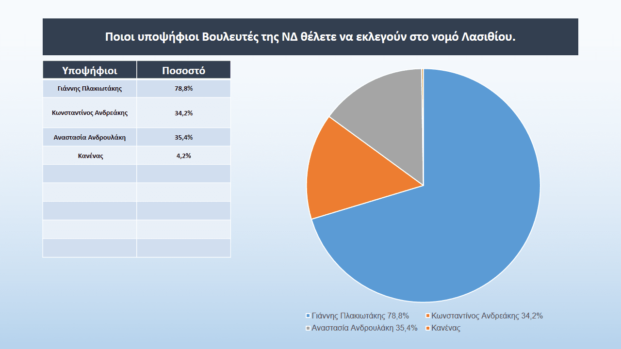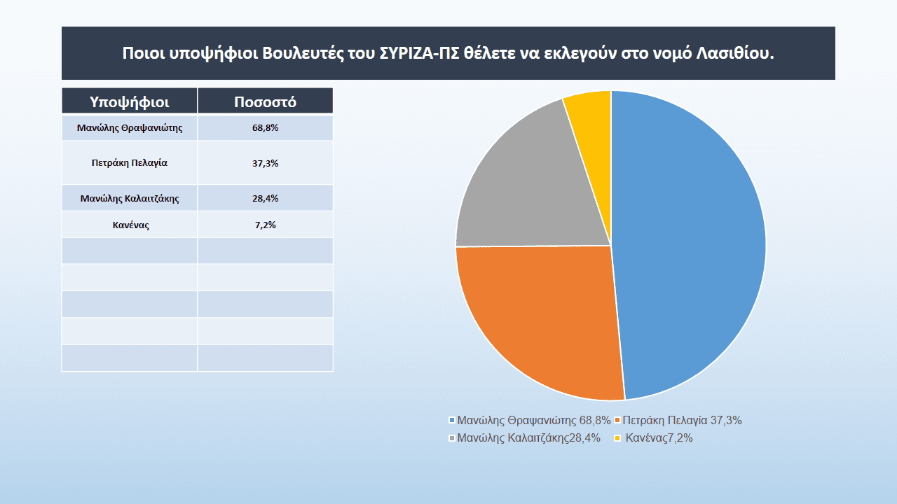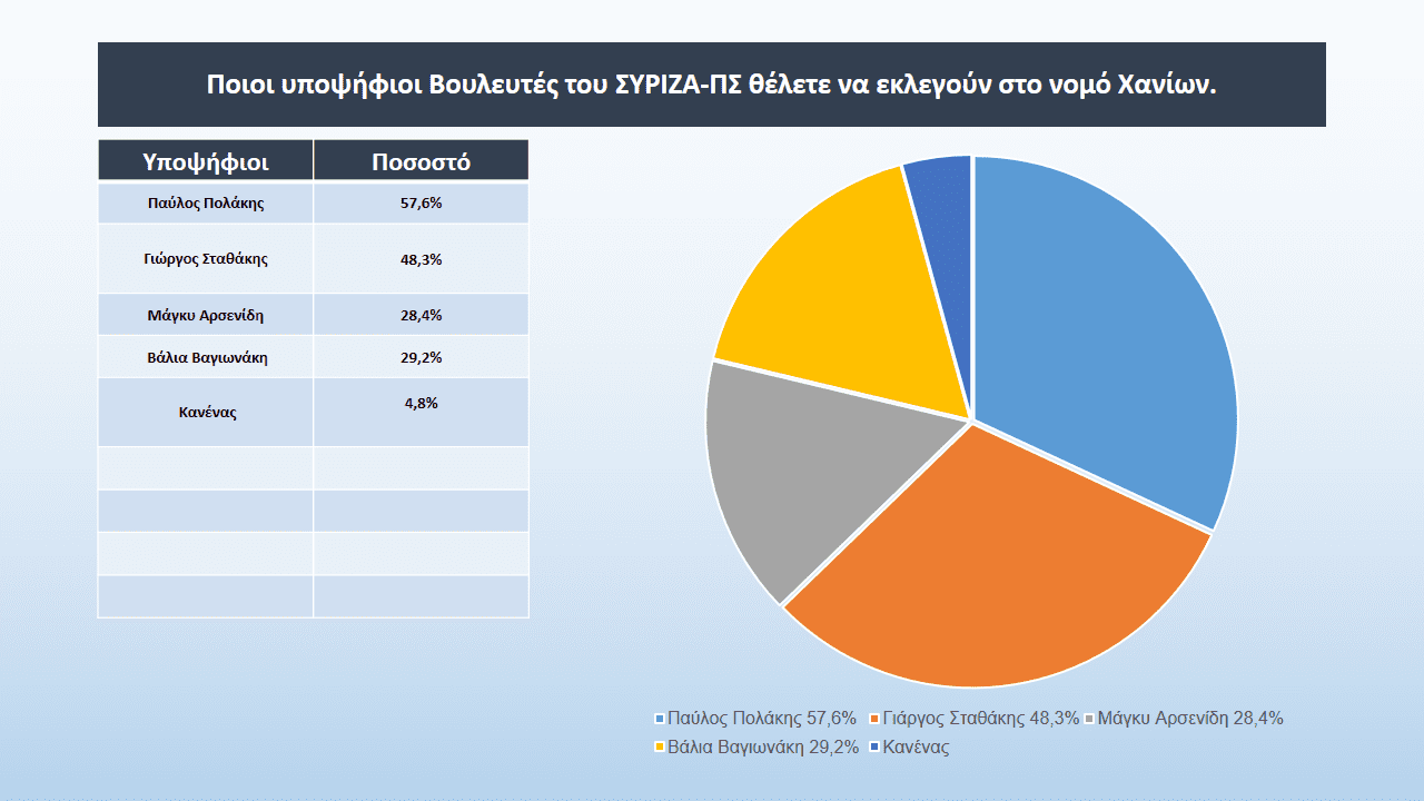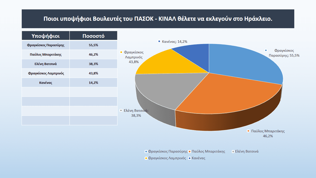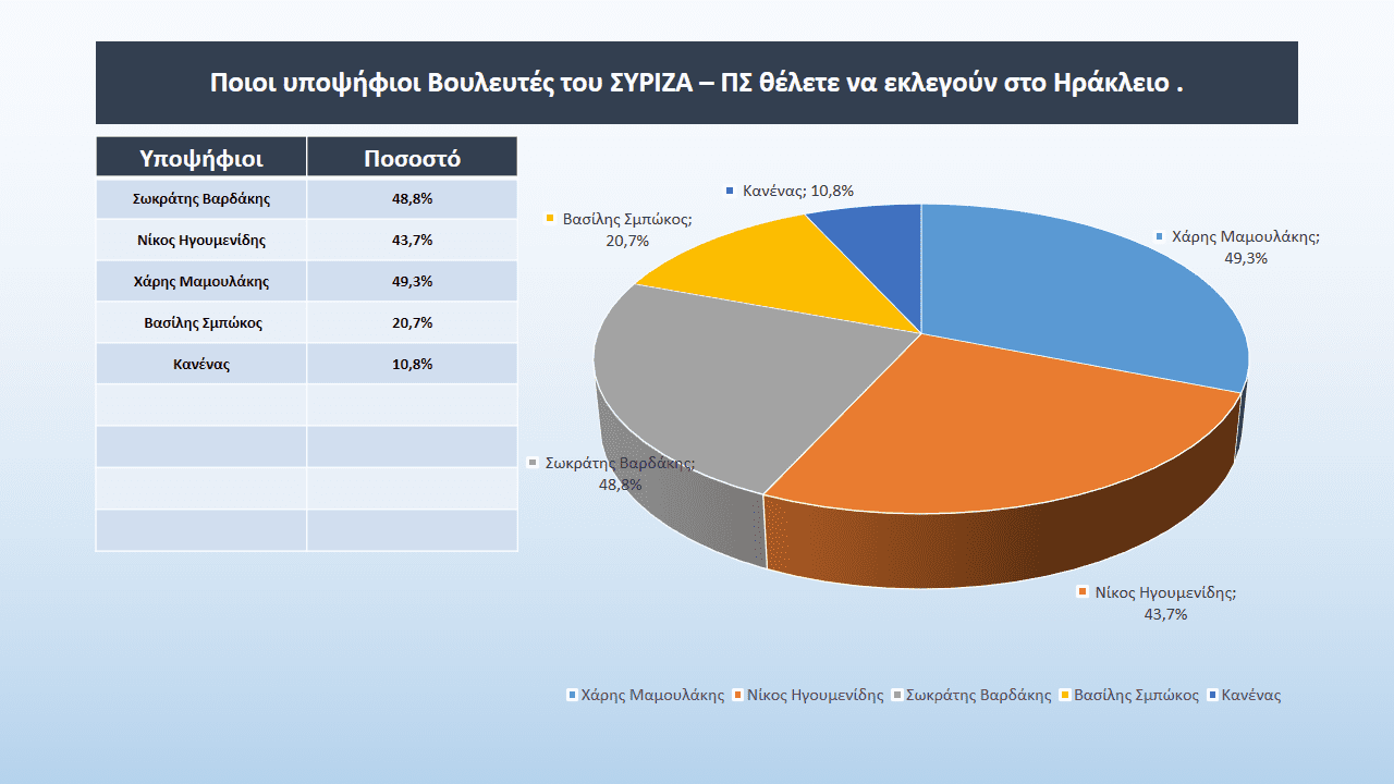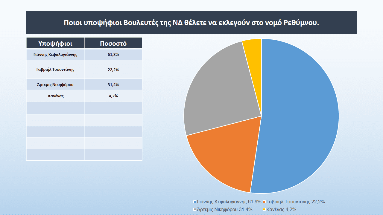 Αναλυτικά ακολουθούν σε πίνακες όλα τα αποτέλεσματα της έρευνας ανά Νομό, σε ολη την Κρήτη , μαζί με το ποσοστά που κερδίζουν όλοι οι υποψήφιοι των κομμάτων.
